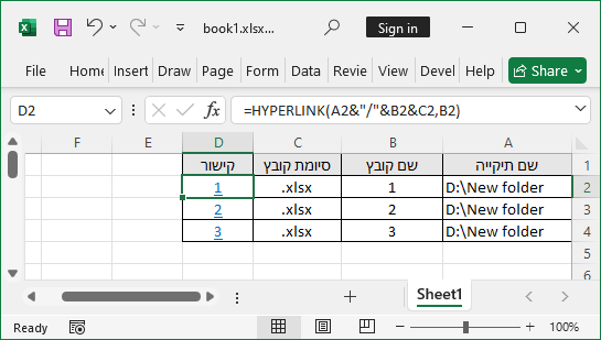 התוצאה היא שבכל תא נקבל קישור לפתיחת הקובץ המתאים.