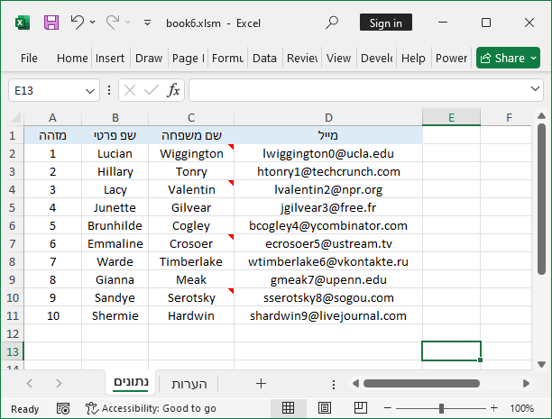 ניצור גיליון אקסל בשם "נתונים" ונגדיר בו טבלת נתונים ובחלק מהתאים נוסיף הערות.