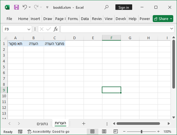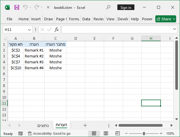 נגדיר גיליון אקסל בשם "הערות" שיכיל טבלה עם העמודות - "תא מקור", "הערה" ו-"מחבר הערה" לטובת ריכוז ההערות מגיליון "נתונים".