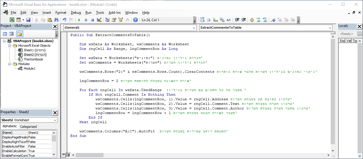 Set wsComments = Worksheets("הערות") 'הגדרת גיליון הערות