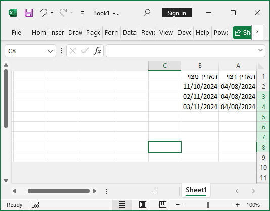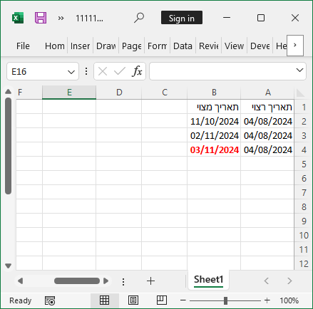 בגיליון אקסל נגדיר בעמודה A תאריך רצוי ובעמודה B תאריך מצוי.