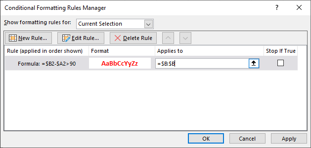 נעדכן את טווח העיצוב המותנה לעמודה B על ידי לחיצה על סמל החץ במסך ובחירת עמודה B באקסל -