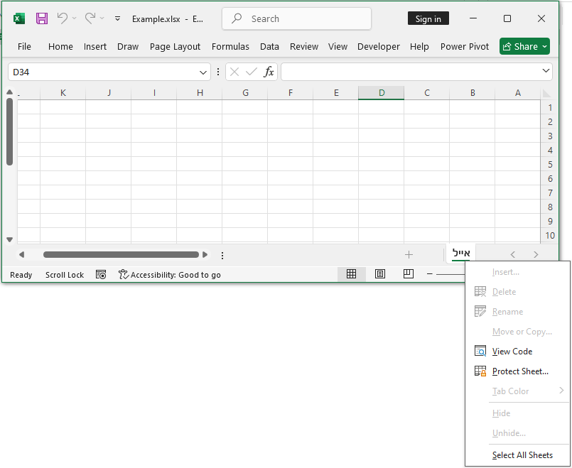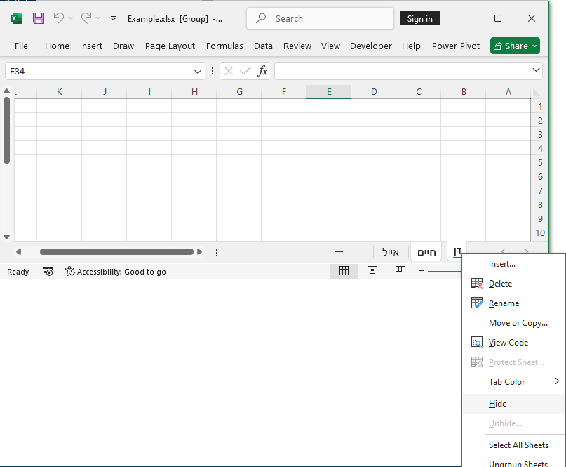 נבחר את הגיליונות שנדרש להסתיר. נלחץ על לחצן ימני בעכבר ונבחר ב-Hide.
