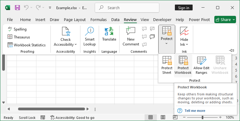 בתפריט Review נבחר ב-Protect ו-Protect Workbook.