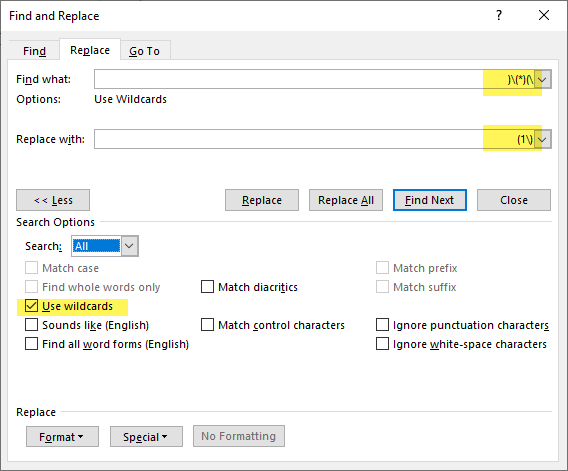ניתן לבצע זאת בוורד על ידי שימוש בתווים כלליים (Wildcards) לחיפוש והחלפת טקסט.