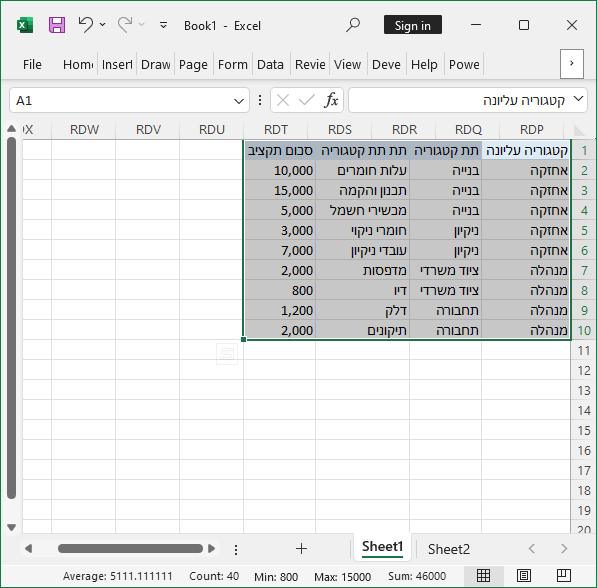 שלב 1 - יצירת טבלת תקציב באקסל - נבנה טבלת תקציב הכוללת את העמודות: קטגוריה עליונה, תת קטגוריה, תת תת קטגוריה וסכום תקציב.