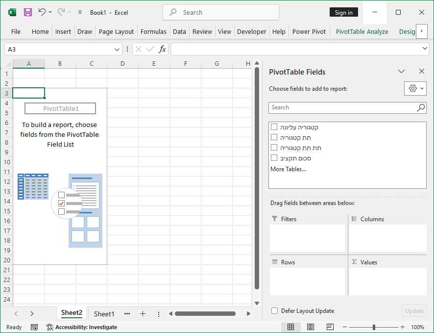 שלב 3 - הגדרת טבלת תקציב לפי קטגוריות ותת קטגוריות בטבלת הפיבוט -