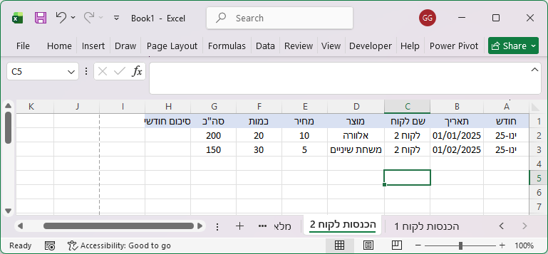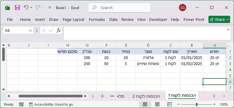 נגדיר טבלת מכירות מסכמת בגיליון "מלאי" שבה נסכם עבור כל מוצר את סך הכמויות שנמכרו מגליונות "הכנסות לקוח 1" ו-"הכנסות לקוח 2".