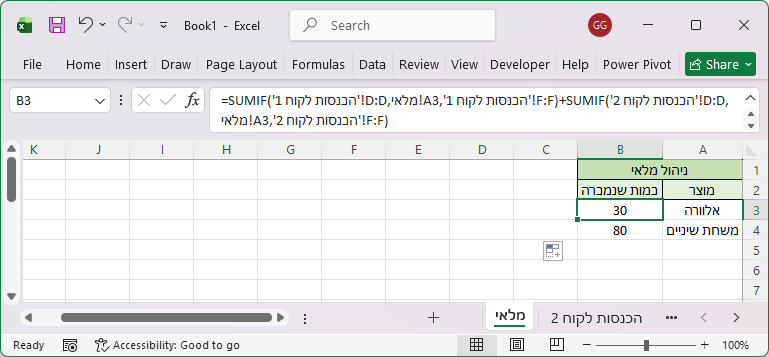 הנוסחה מחפשת את המוצר שמופיע בתא A3 בגיליון "מלאי" בעמודת D (מוצר) בכל אחד מגליונות המכירה וסוכמת סך כמות המכירות לכל מוצר (עמודה F).