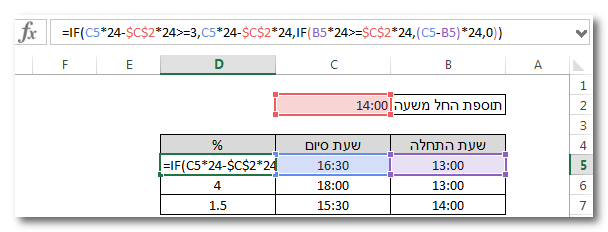1) התנאי הראשון בודק אם שעת הסיום גדולה משעת תחילת התוספת (14:00 בתא C2) בשלוש שעות. אם כן, הערך שיוחזר יהיה ההפרש בין שעת הסיום לשעה 14:00. דוגמא לתוצאה בתא D6.