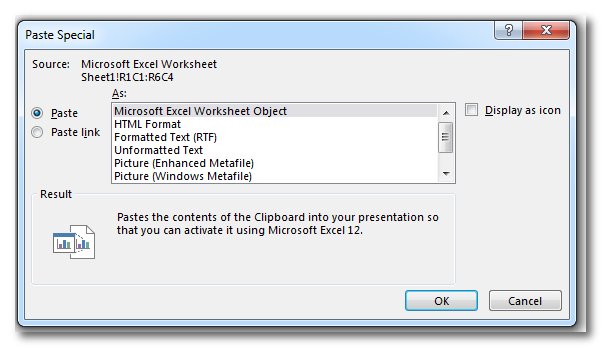 1) העתק/הדבק תוכן של גיליון אקסל (טבלה או גרף) לתוך שקף. הכוונה להדבקה רגילה (PASTE). בצורה זו קובץ האקסל מוטמע לתוך פאוור פוינט והופך חלק ממנו. לשיטה הזו שני חסרונות: 1) עדכון נתונים על ידי משתמשים שונים מבוצע לקבצים שונים, ואז אין גרסא אחת לכולם 2) אם קובץ אקסל הוא גדול (מבחינת MB) המצגת גם תשקול הרבה.