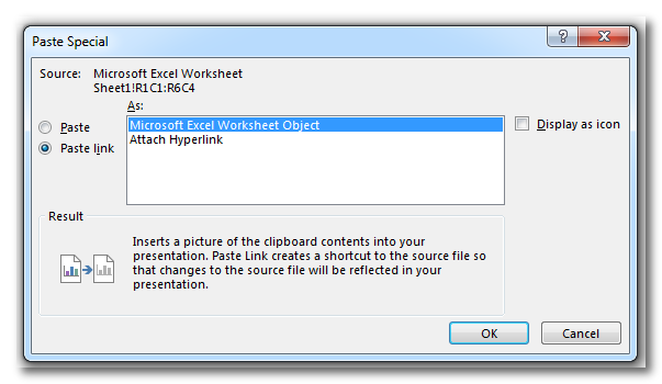 2) שיטה אחרת היא לבצע הדבקה עם קישור (PASTE HYPERLINK). שיטה זו נוחה כאשר יש שרת משותף אחד למשתמשי המצגת, ואז העדכונים מבוצעים בקובץ אקסל שנפתח מתוך בשרת משוקפים במצגת לאחר ביצוע רענון.