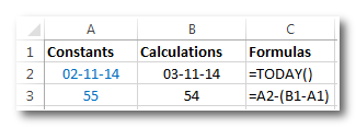 תא B2 יכיל נוסחה שמחזירה את התאריך של היום (הנוסחה מוצגת בתא C2), ואילו בתא B3 תהיה התוצאה של הפרש הימים מהמספר ההתחלתי (הנוסחה בתא C3).