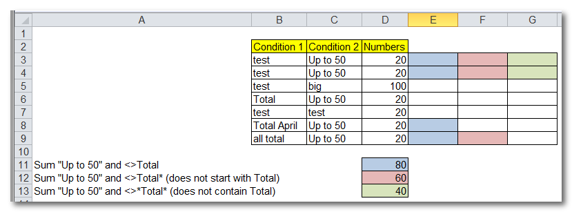 1 - סכימה של תאים תחת תנאי "Up to 50" בעמודה C וגם תנאי "Total" בעמודה B (התאמה מדוקית למילה Total):