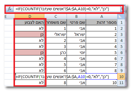 בשלב ראשון יש נוסיף עמודת נוסחאות תוך שימוש בנוסחת COUNTIF, שתחזיר מספר הגדול מאפס אם קיים מספר תעודת זהות בטבלה בגיליון השני: