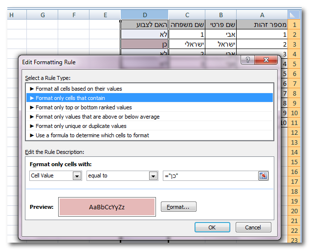 בשלב השני ניישם עיצוב מותנה על עמודה D - אם מופיע בה ערך "כן" - נצבע: