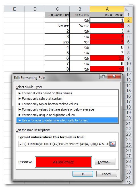 האם יש אפשרות לשלב עיצוב מותנה באקסל של צביעת תא (!) ע"י חיפוש מספר זהה בטבלה בגיליון אחר (!), כלומר עיצוב מותנה עם VLOOKUP?