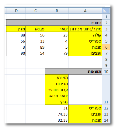 נניח שיש שתי טבלאות - טבלת נתונים וטבלת תוצאות עם ערכי ממוצע למכירות: