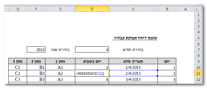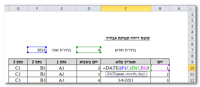 2) כעת אפשר לבנות נוסחה שתשנה את התאריך המלא בהתאם לחודש הבנחר :