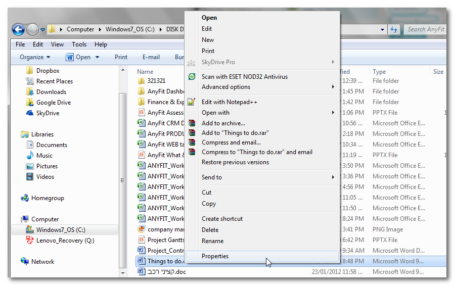 1) קליק ימני של עכבר על הקובץ ובחירת אפשרויות: