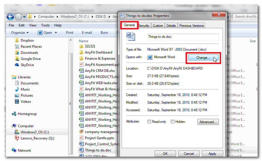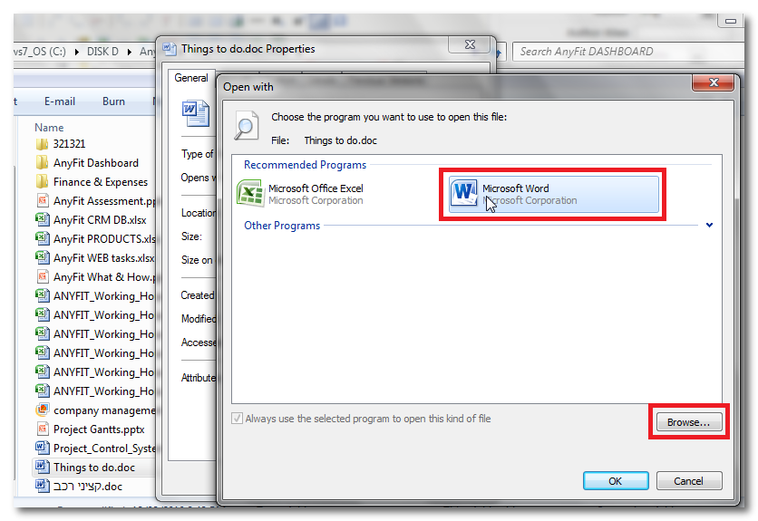 משום-מה קבצי DOC במחשב שלי משוייכים כברירת מחדל לתוכנית שלא יכולה לפתוח אותם. אני מנסה להפוך את ברירת המחדל - שייפתחו תמיד עם אופיס (וורד) - אלא שלא ניתן לסמן את השורה של "פתח תמיד באמצעות תוכנית זו" (היא מופיעה בצורה "חיוורת" ובלתי ניתנת לסימון)