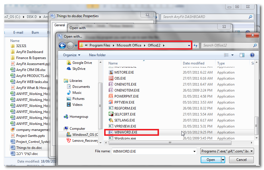 אם היישום הרצוי אינו מופיע ברשימה המוצעת ניתן לבחור אותו (בהנחה שהוא מותקן במחשב) על ידי לחיצה על סייר ובחירת היישום מתוך ספריית האופיס בכונן C, לדוגמא: