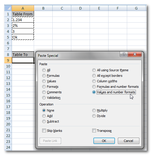 בבחירת סוג ההדבקה יש אפשרויות רבות. במקרה הנדון נדרש לשמר את ערכי התאים והפורמט: