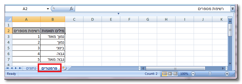 1) נבנה רשימת המרה בגיליון "פרמטרים" - לכל מספר נתאים ערך מילולי: