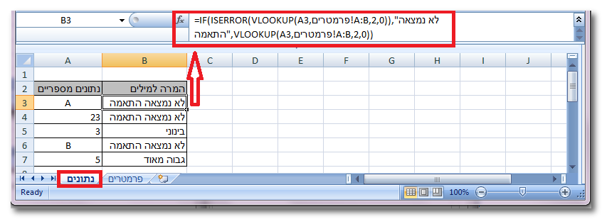 2) בשלב השני נוסיף עמודה ליד עמודת המספרים בגיליון "נתונים", ובה נוסיף נוסחת VLOOKUP המתאימה ערכים: