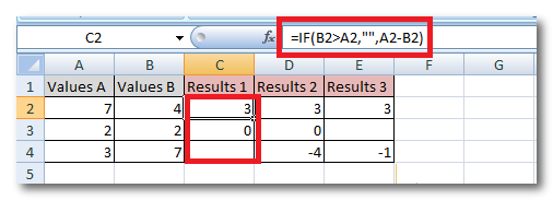 1) נניח שקיימות שתי עמודות של ערכים: ערכי A וערכי B. נוסיף נוסחא לעמודה C שתחשב את ההפרש בין B ל-A תוך שילוב תנאי: