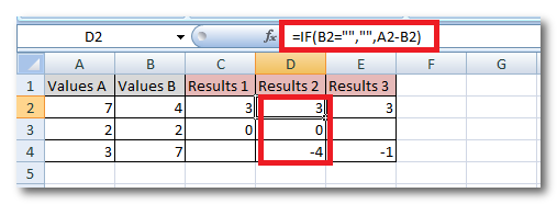 התנאי בנוסחת IF שואל האם הערך של תא B2 גדול מהערך שבתא A2. אם כן - תוצאת הנוסחא תהיה "" (כלומר תא ריק). אם התאני לא מתקיים (כלומר זה לא נכון ש B2 גדול מ-A2), התוצאה תהיה ההפרש ביניהם.