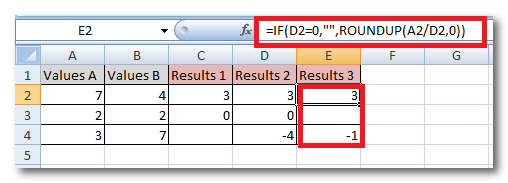 3. אני מבקש נוסחה לחשב חילוק של שני תאים למשל A1/D1= אם יש שארית אז לעגל תוצאה כלפי מעלה בכל מקרה
