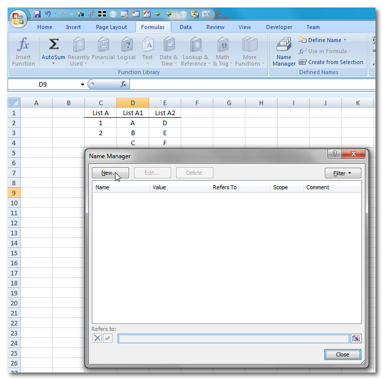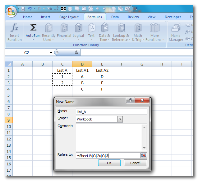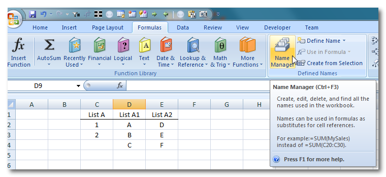 כעת ניכנס ל"נוסחאות" ונגדיר שם טווח עבור תא A1: