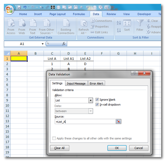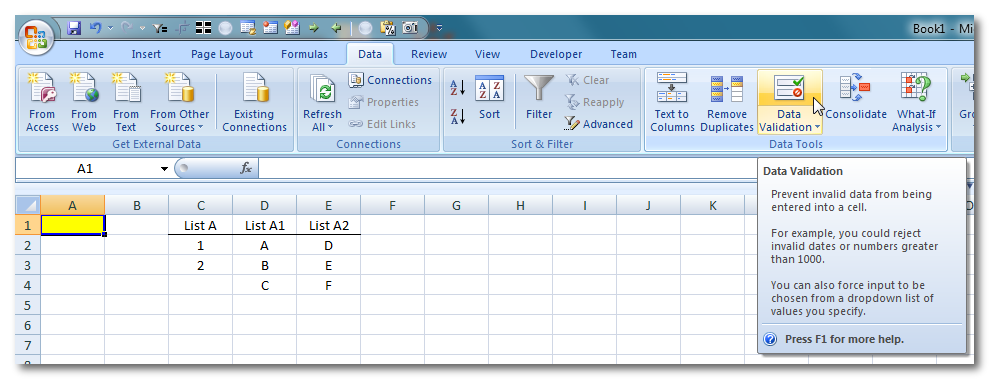 כעת, נקשר את הטווח לתא A1 באמצעות "אימות נתונים":