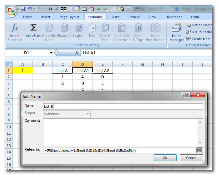 עכשיו, צריך להגדיר רשימה נוספת עבור תא B1 כך שתהיה הפרדה בערכים עבור 1 ו-2. נגדיר זאת באמצעות התנייה בהגדרת הטווח על ערך התא A1, כלומר מוגדר כאן טווח דינאמי כתלות בערך בתוך תא A1: