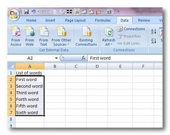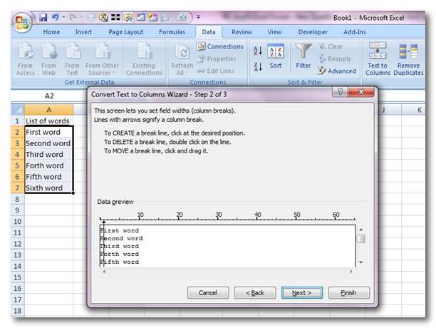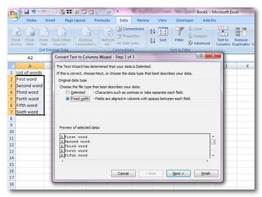 אם רשימת המילים שלך מופיעה בעמודה אחת עם 1000 שורות לדוגמא, אזי תוכל להשתמש באופצית text to column כפי שמפורט להלן: