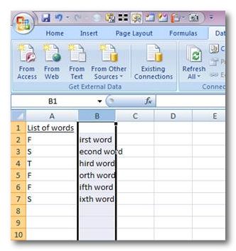 5) השלב האחרון, הינו מחיקת הערכים בעמודה Bלמעשה קיבלנו בעמודה A את רשימה האותיות המתחילות את המילים המקוריות במידה ורשימת המילים שלך אינה מסודרת בעמודה אלא מפוזרת בתוך הגיליון, אזי נדרש לפתרון אחר (שילוב של נוסחאות משורשרות או קוד)