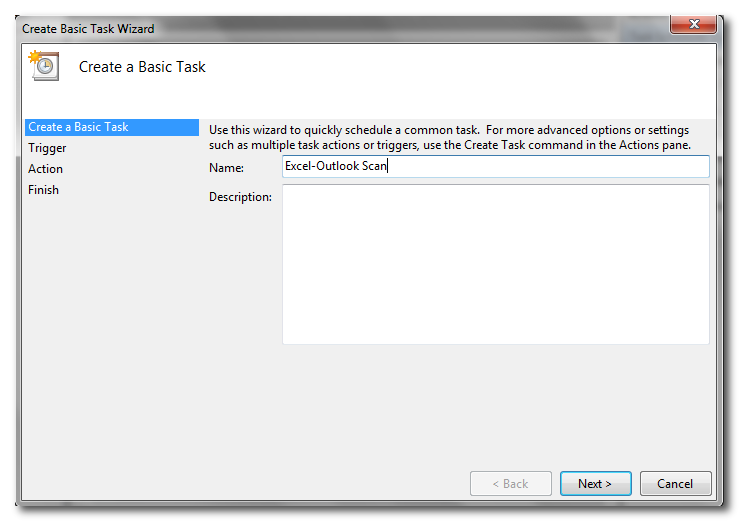 3) הדרך הפשוטה להגדיר משימה חדשה הינה בעזרת אשף משימות. נגדיר שם למשימה וניתן גם להוסיף תיאור:
