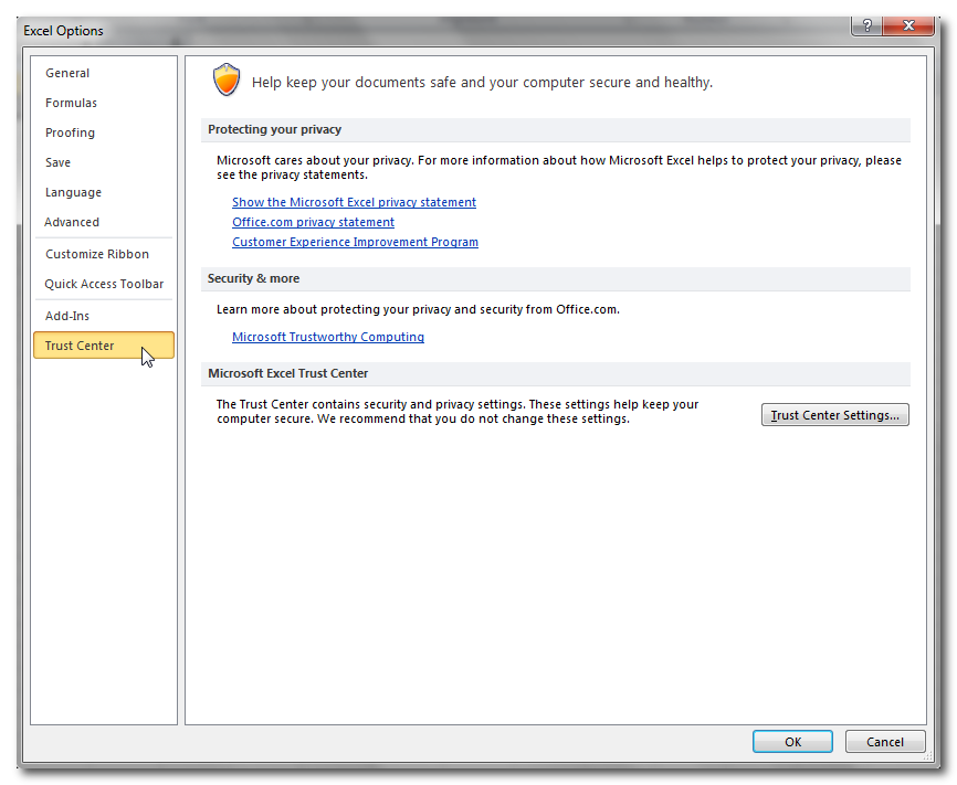 להגדרות אלו השפעה על תפקוד תוספים וריצת VBA, ולעיתים יש לשנותן "בזהירות", כלומר מומלץ לשנות הגדרות רק כאשר עובדים עם קבצים ממקור מוסמך*.