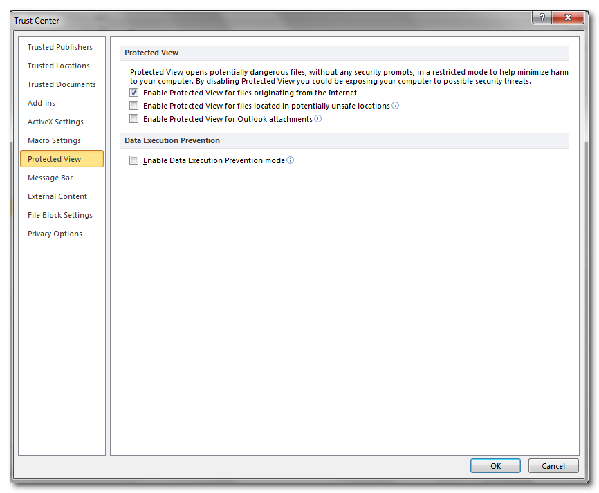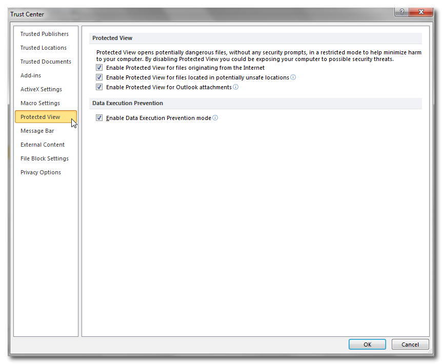 אחת הדרכים האפשריות לפתרון הבעיה עשויה להיות בהגדרות אבטחה באקסל 2010. גרסת אופיס 2010 שודרגה באפשרות להגדרות אבטחה נוספות, ביניהן Data Execution Prevention.